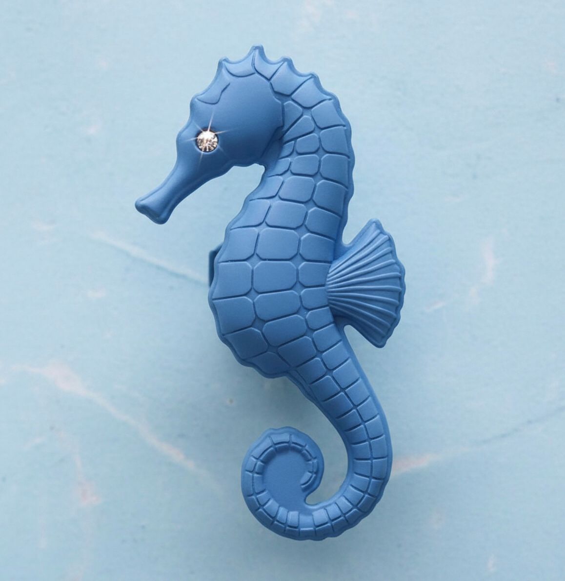 Transforme o ambiente infantil com este puxador em formato de cavalo marinho azul, ideal para gavetas e armários.